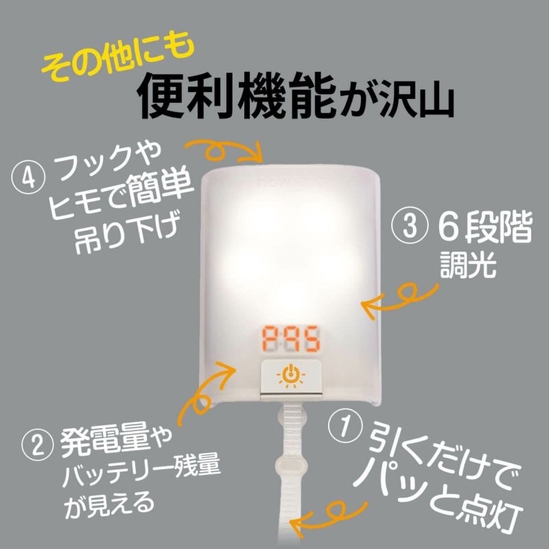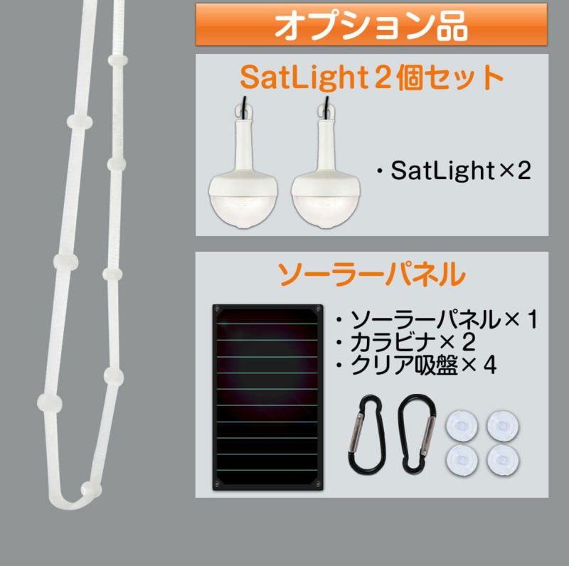 NowLight(プルコード付属)×1、SatLight(5mのケーブル付)×2、専用ソーラーパネル×1、アクセサリーパック×1(スペアコードパーツ×2、フック×2、紐×1)、DCケーブル(4m)×1、カラビナ×2、クリア吸盤×4、日本語取説×1、英語版マニュアル×1 |