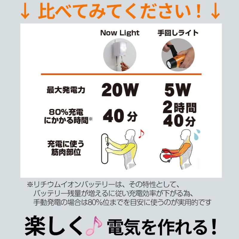 ・約1分の手動充電で、最大2時間のライト点灯またはスマホでの通話最大15分が可能