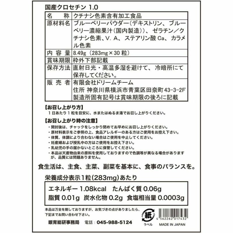 クチナシ色素、ブルーベリー濃縮果汁、ビタミンA、ステアリン酸カルシウム |