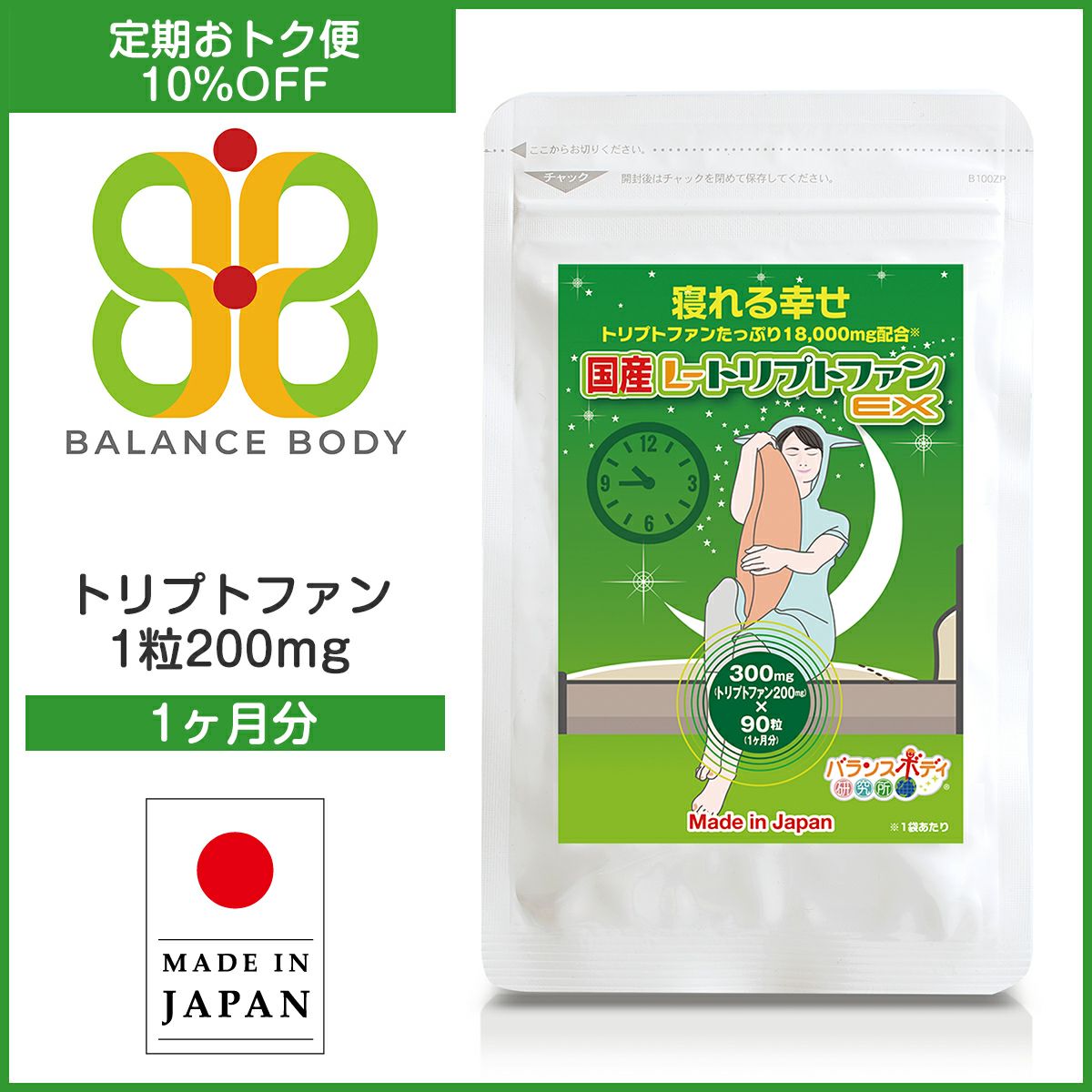 他の画像を見る 定期販売 送料無料10%OFF 国産サプリシリーズ定期注文 【定期】トリプトファン 国産L-トリプトファンEX(300mg×90粒) サプリメント トリプトファン 1粒 200mg アミノ酸 サプリ 休息 お休みタイム 不眠 快眠 4.00 定期購入価格 ¥ 1,431 税込 詳細を見る お気に入りに登録する